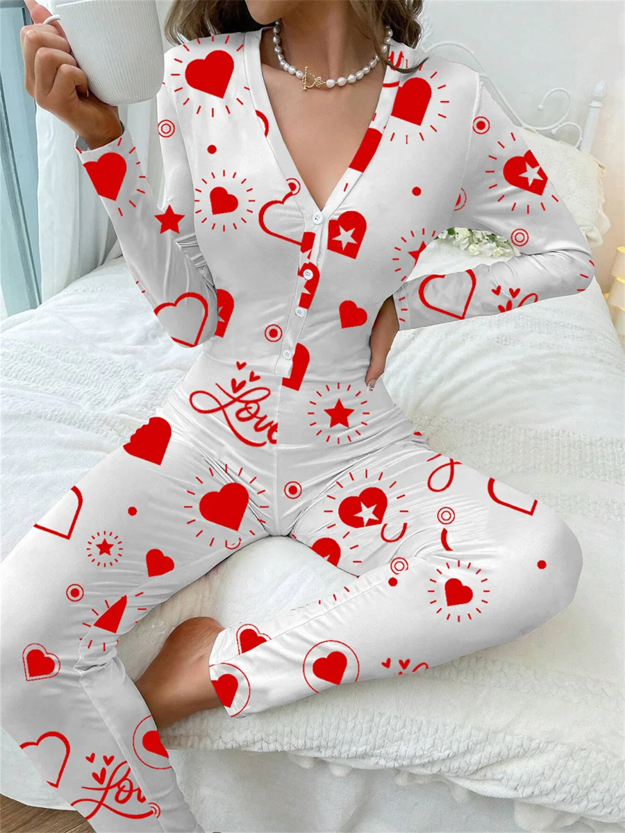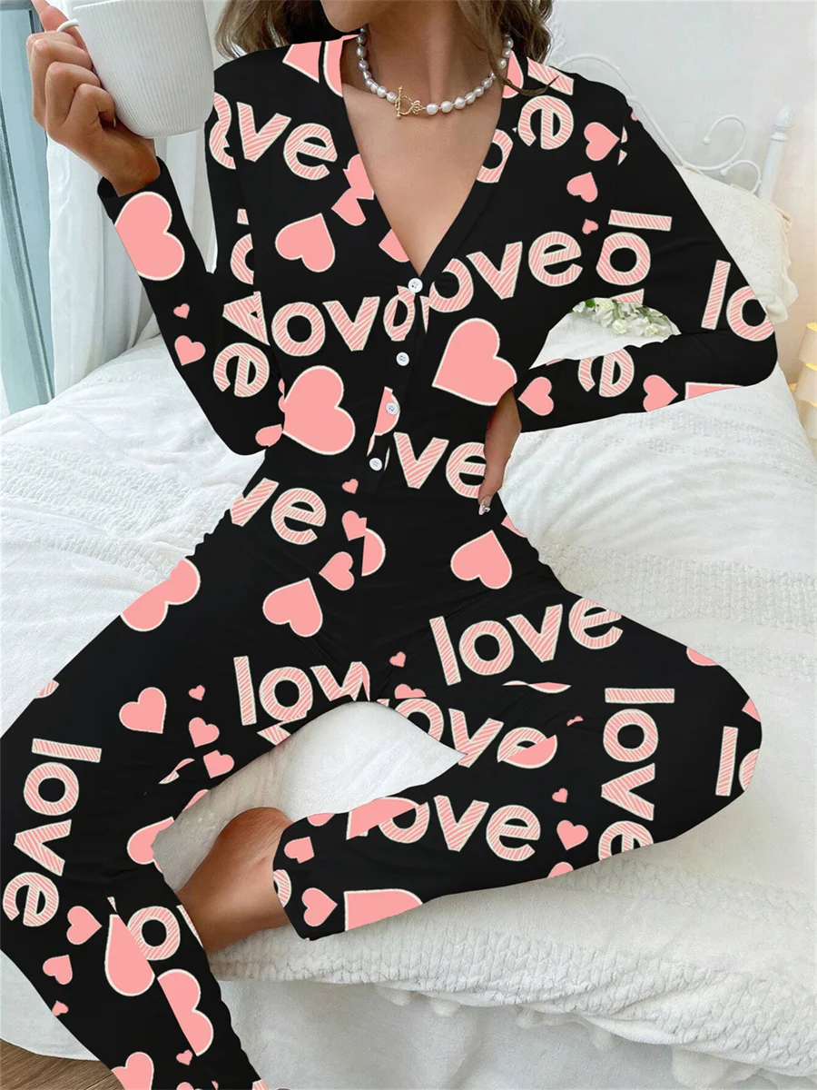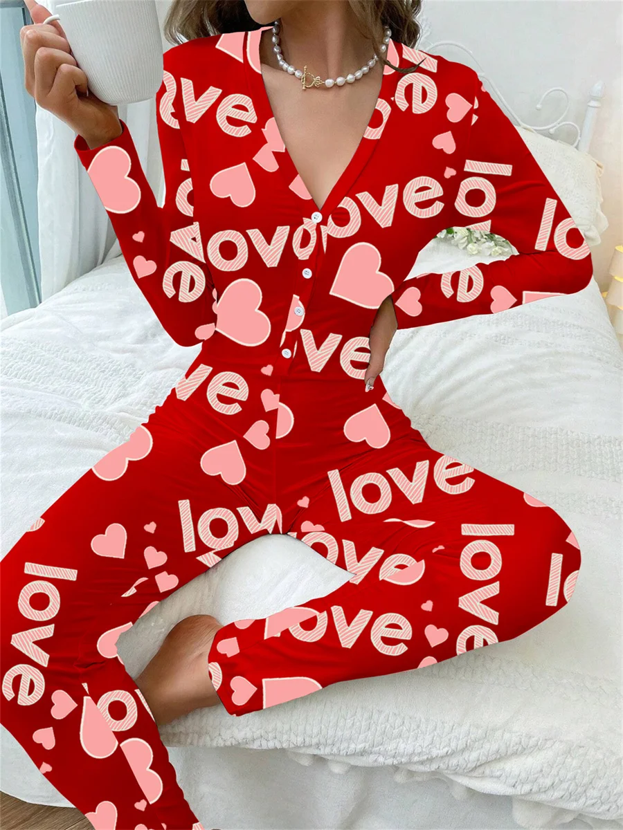 2024 Valentine's Day Sleepwear Jumpsuit Long Sleeve Butt Flap Romper Women V-neck Heart Letters Print 1 Piece Lounge Nightwear