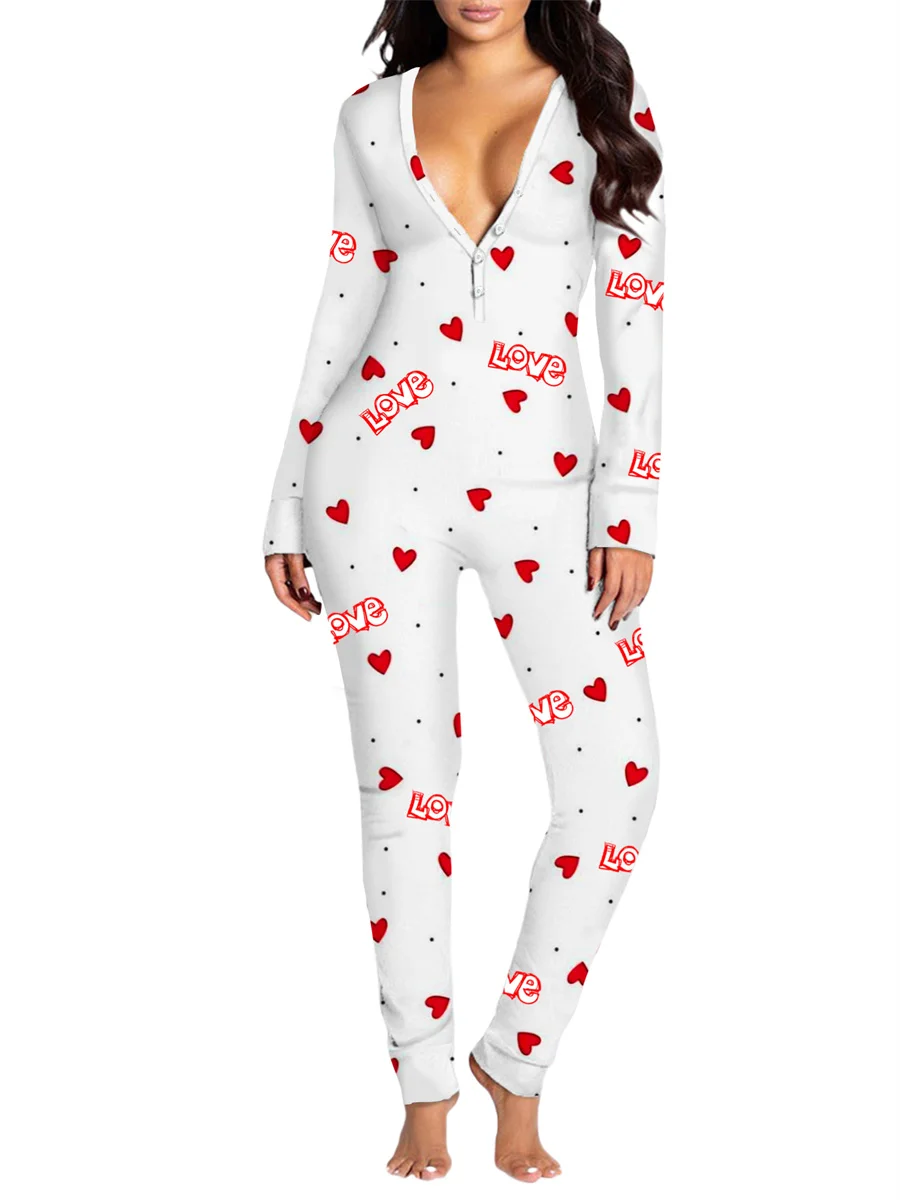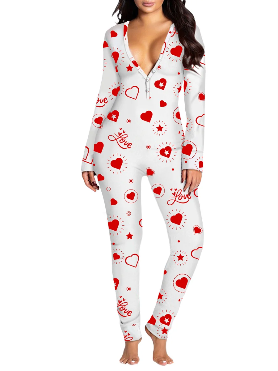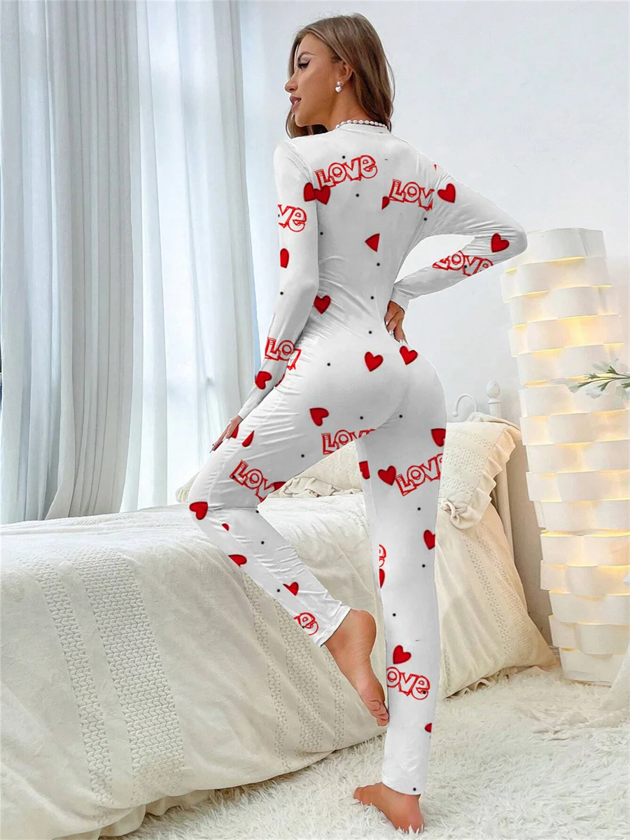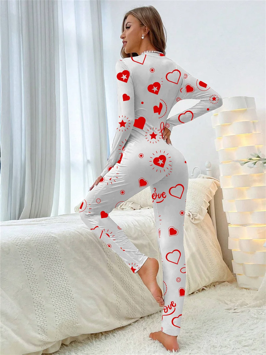 2024 Valentine's Day Sleepwear Jumpsuit Long Sleeve Butt Flap Romper Women V-neck Heart Letters Print 1 Piece Lounge Nightwear