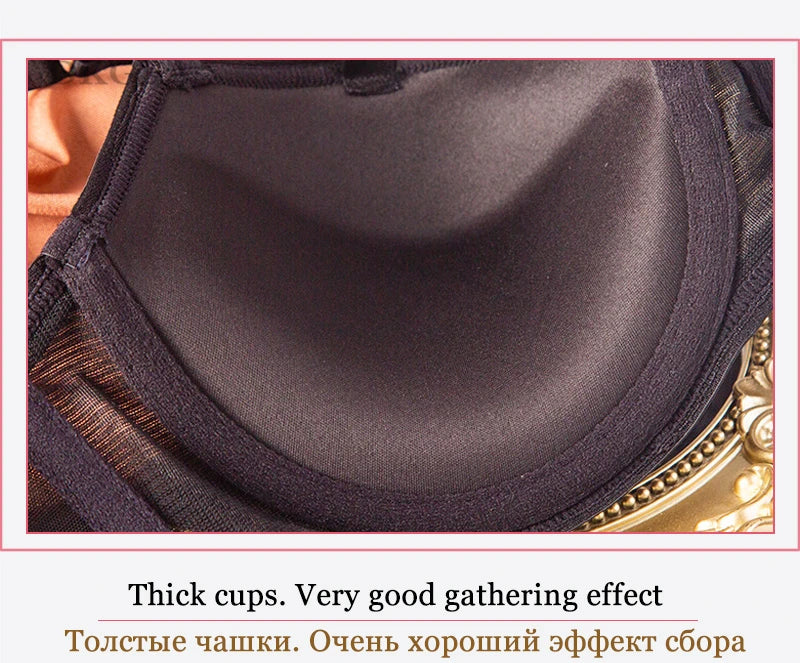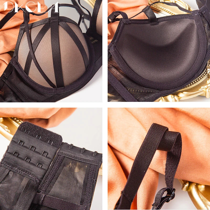 DKGEA Black Bandage Push-Up Bra & Brief Set – Sexy Deep V Floral Embroidered Lingerie for Women (B–D Cup, Sizes 70–95)