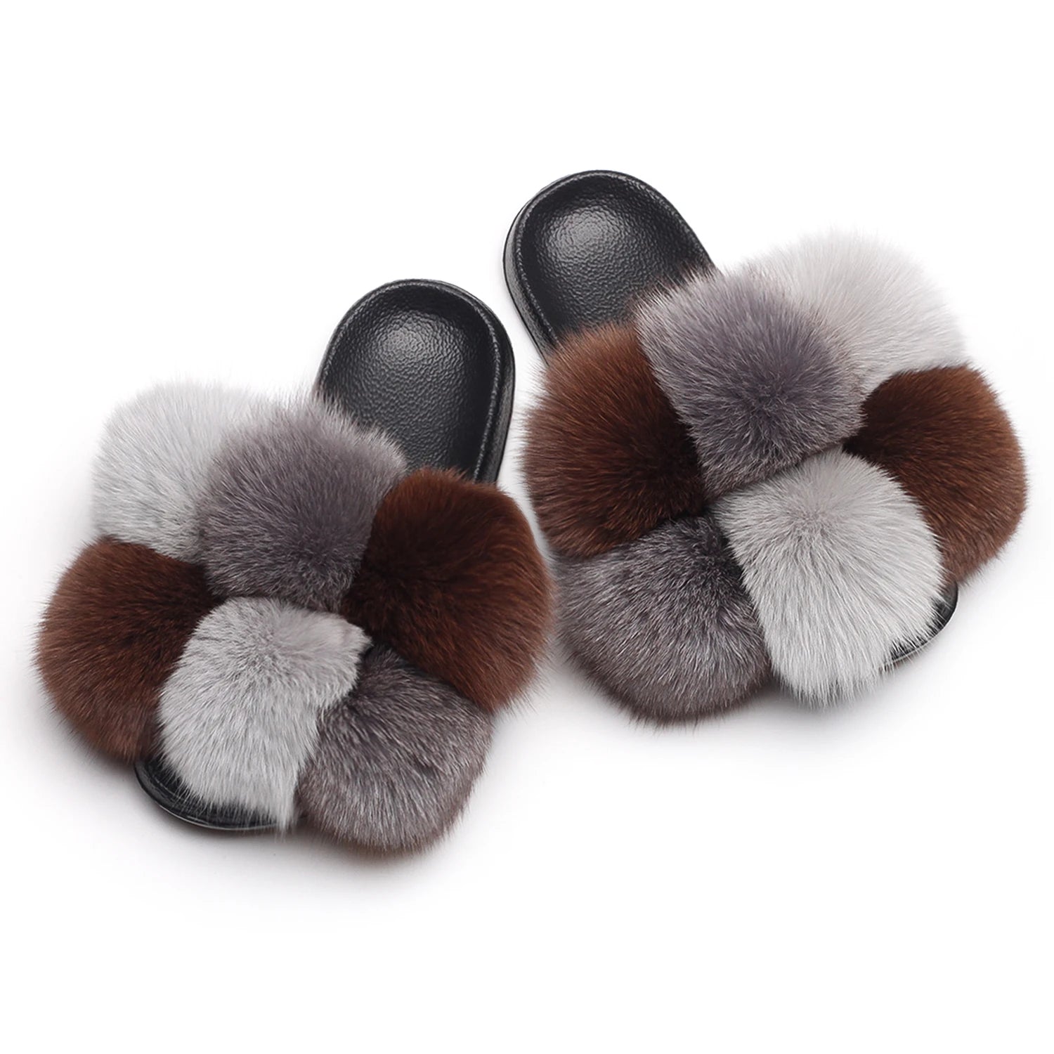 Real Fox Raccoon Fur Slippers - Fluffy Pom Pom Fur Slides & Beach Sandals